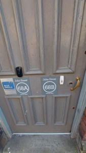 Directions: To the left of the front door and window of the Optician EYEEYE, there is a grey door. Ring the doorbell for Unit 68B.